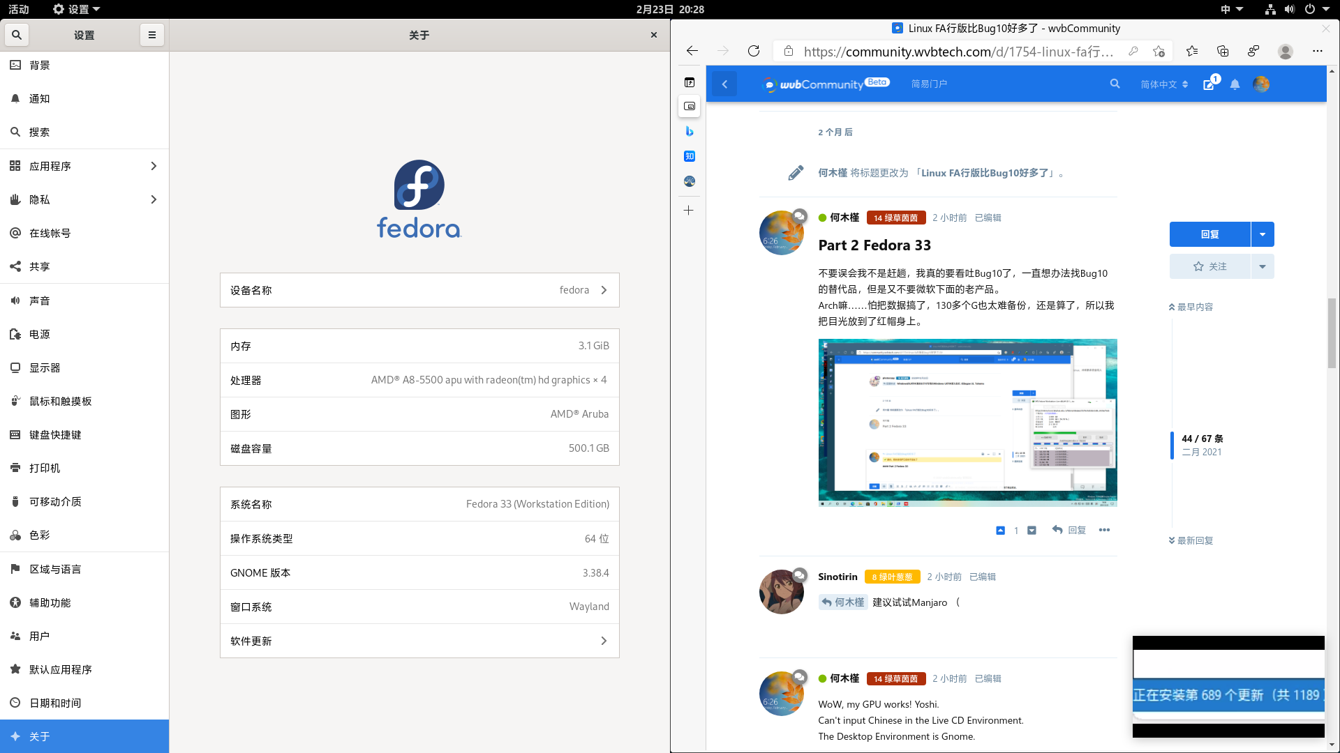 panjk0518 何沐瑾 新电脑(128G的那个):无论任何发行版都完美 老电脑:Ubuntu缺网卡驱动,Fedora缺网卡驱动,Deepin缺网卡驱动,原版Windows缺声卡驱动(无法正常安装),solus(一个超级小众的发行版(新电脑没装过)):缺蓝牙驱动。其他发行版等待试验(好像混进来一个非*nix系统~)。
